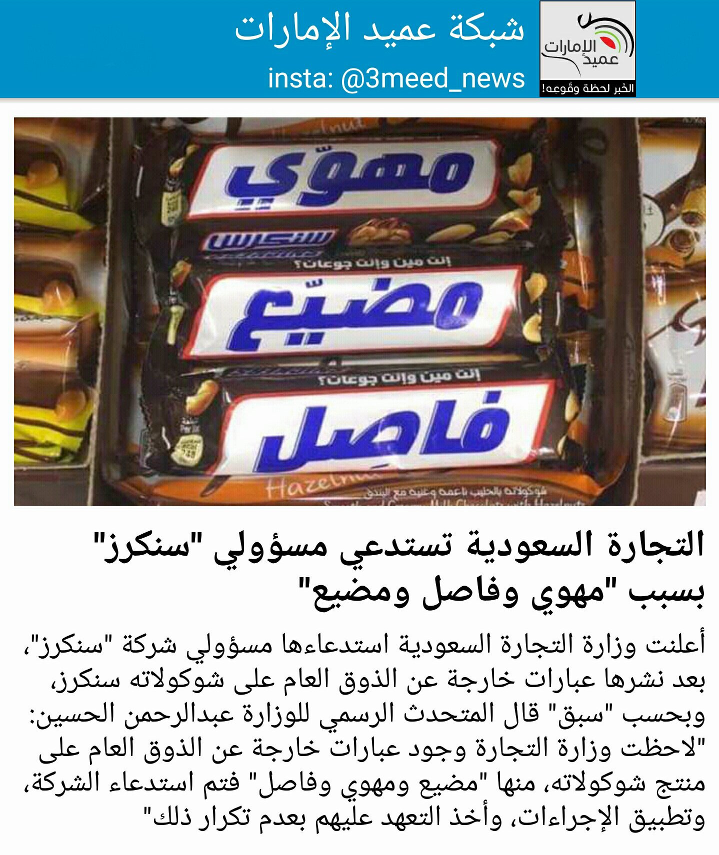 شبكة عميد الإمارات على تويتر أعلنت وزارة التجارة السعودية استدعاءها مسؤولي شركة سنكرز بعد نشرها عبارات خارجة عن الذوق العام على شوكولاته سنكرز وبحسب سبق قال Https T Co Cd6gi12h6p